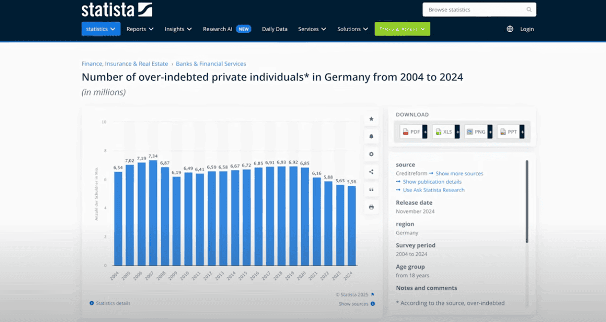 Let’s begin at the very start of the journey, before we even think about building up significant savings. What if you’re in debt and your net worth is actually negative? This situation is more common than you might think, with over 8% of German adults being over-indebted. The good news is that this number has been slowly falling for years, and if you follow these proven steps, you will successfully get out of debt, too.