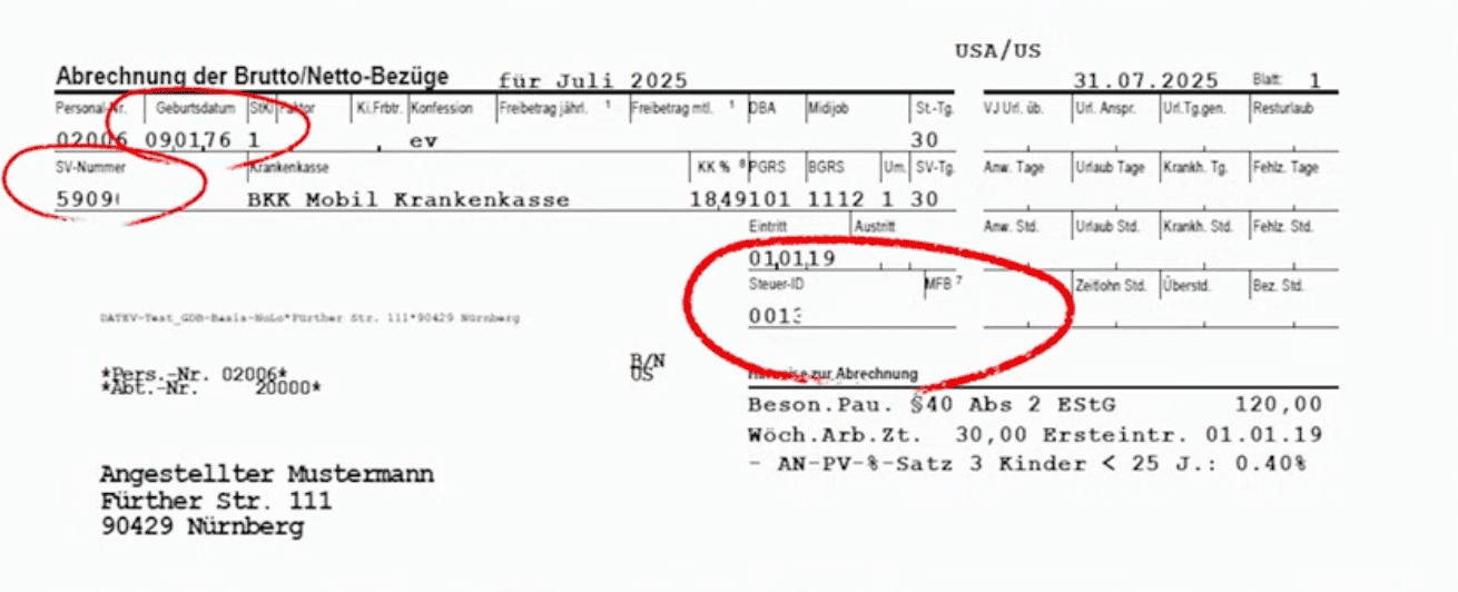 Before we dive into the complex math of your gross salary, let’s speedrun the top of your payslip to catch fundamental errors. First, verify your basic identity data: date of birth, Tax ID, and Social Security number. These should never change, but the header also contains dynamic information like your Tax Class (Steuerklasse). If you recently married or your spouse’s income shifted, staying on the default setting can cost you hundreds of Euros in net pay every month.