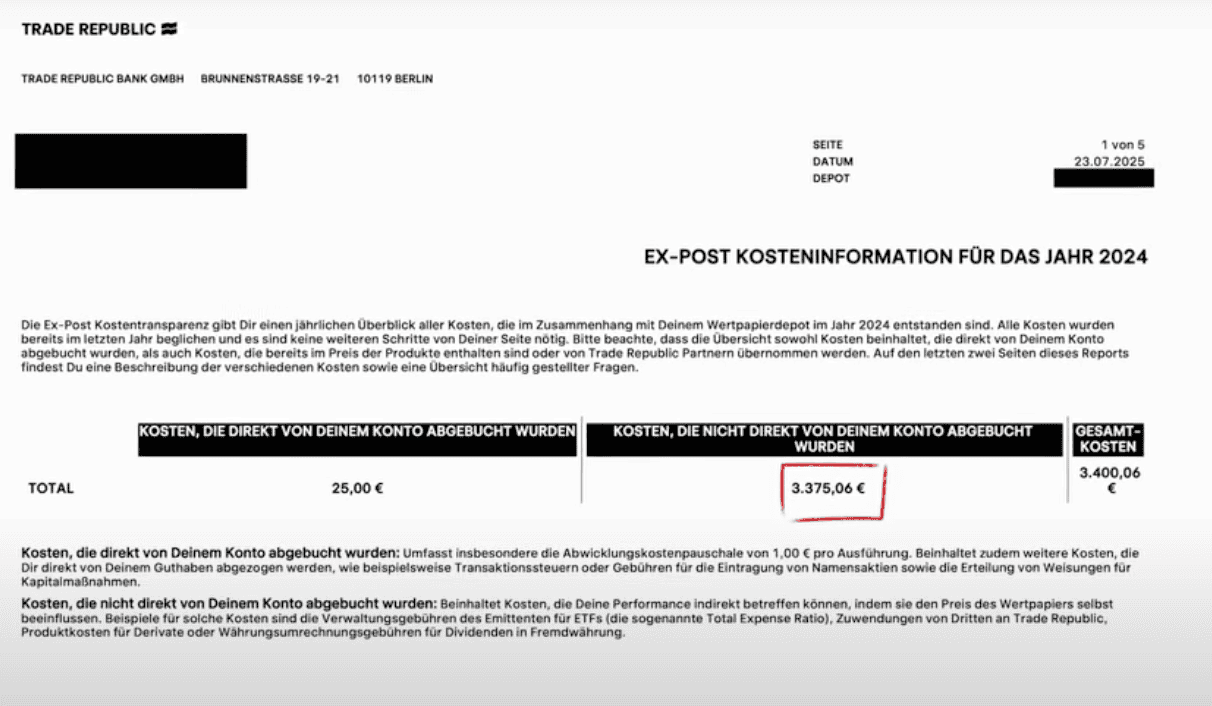 These kickbacks rarely appear in your Neobroker’s app or on your regular statements. To see the real picture, you have to dig into the obscure and often complex ex-post cost information documents that are legally required to be provided. One of our clients actually sent us his numbers for 2024. Trade Republic claimed he paid only €25 in trading fees. But when we meticulously checked his ex-post statement, the total was a shocking €3,375. That’s an astonishing 13,400% more than he thought he was paying. And with a total trading volume of just €11,500, nearly 30% of his investments went straight to fees. That’s simply insane.